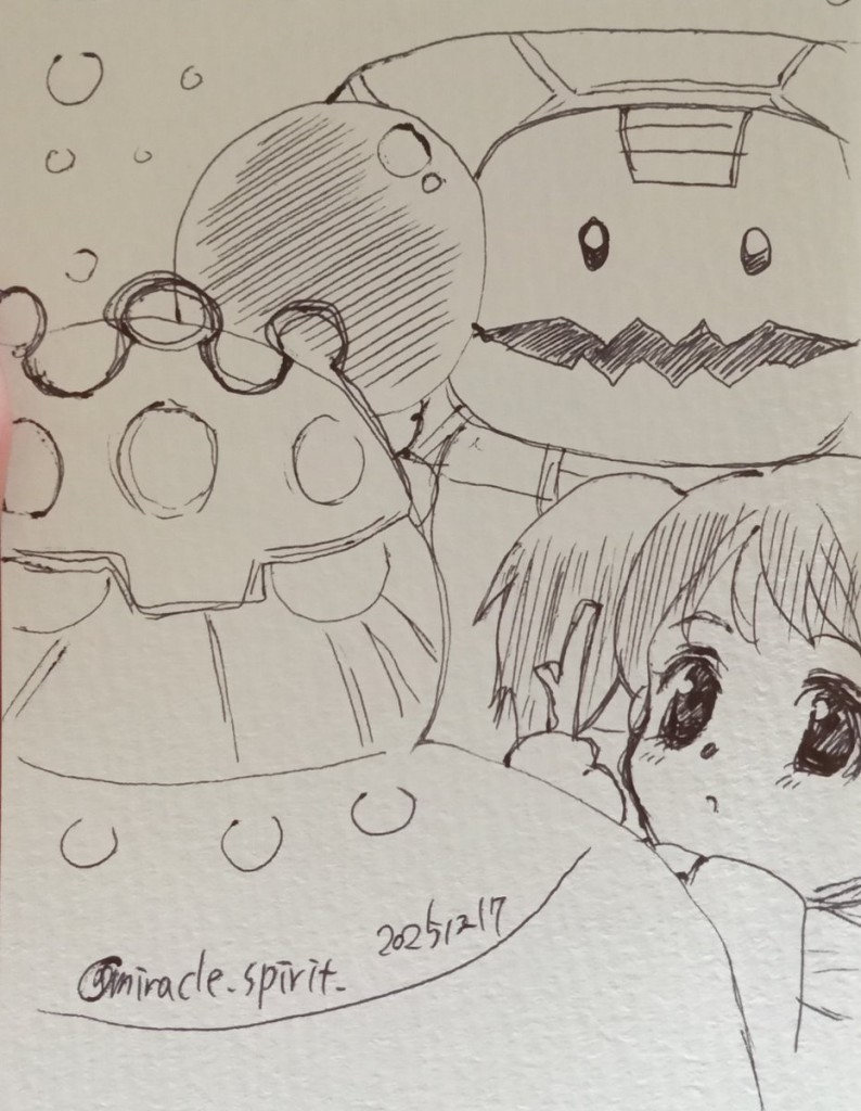 #ライブアライブ タロイモとカオリ ブリキ大王模したゆきだるま描こうとしてうまくいかんかった感。 左赤っぽいのはビミョーに見切れたワイの親指。